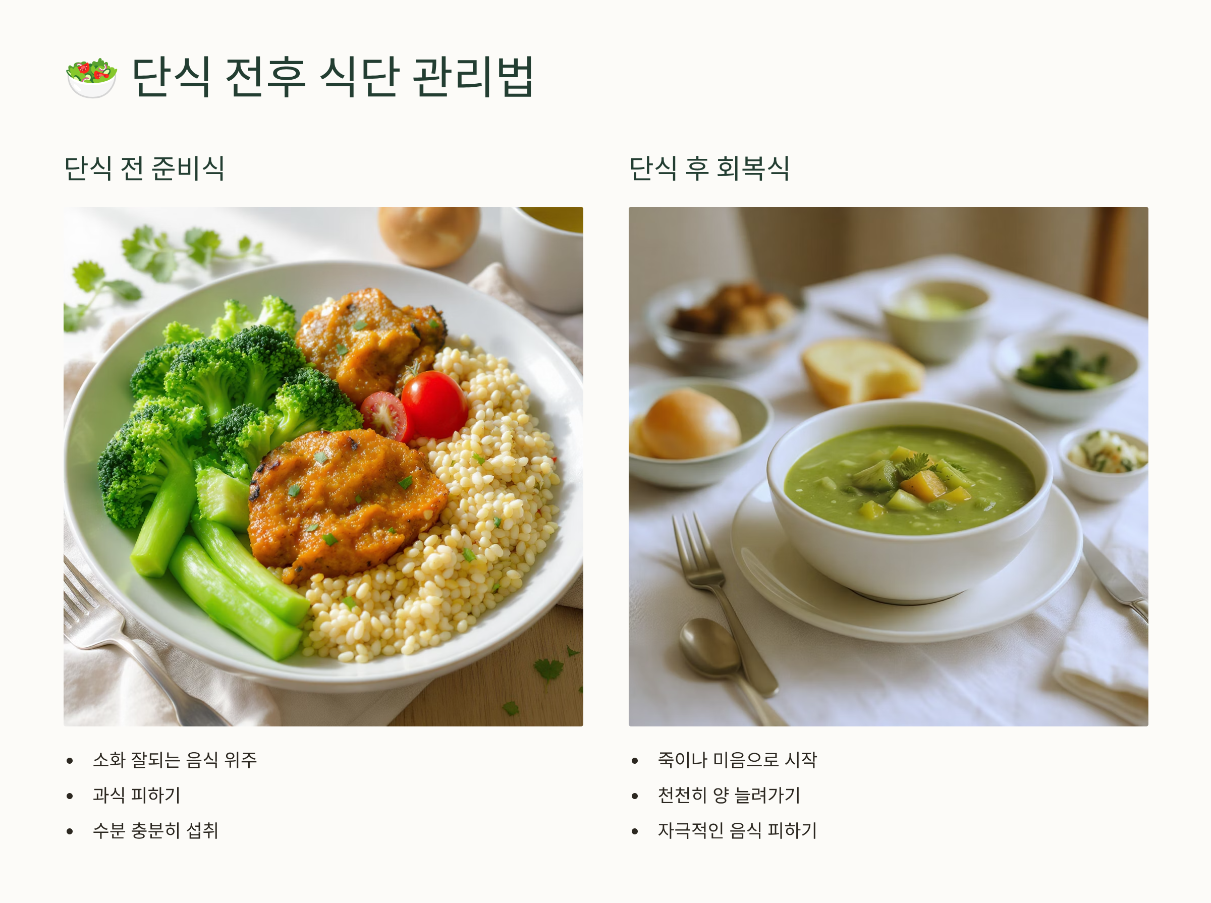 단식 후 복식(리피딩) 과정은 매우 신중하게 진행해야 해요. 월요일 아침은 따뜻한 물 한 잔으로 시작하고, 30분 후에 사과 반 개나 바나나 반 개를 먹어요. 1시간 후에는 요구르트나 스무디를 마시고, 점심에는 죽이나 부드러운 달걀찜을 먹는 식으로 점진적으로 늘려가세요. 첫날은 전체 칼로리를 1000-1200kcal 정도로 제한하고, 이틀에 걸쳐 정상 식사로 돌아가는 것이 안전해요.