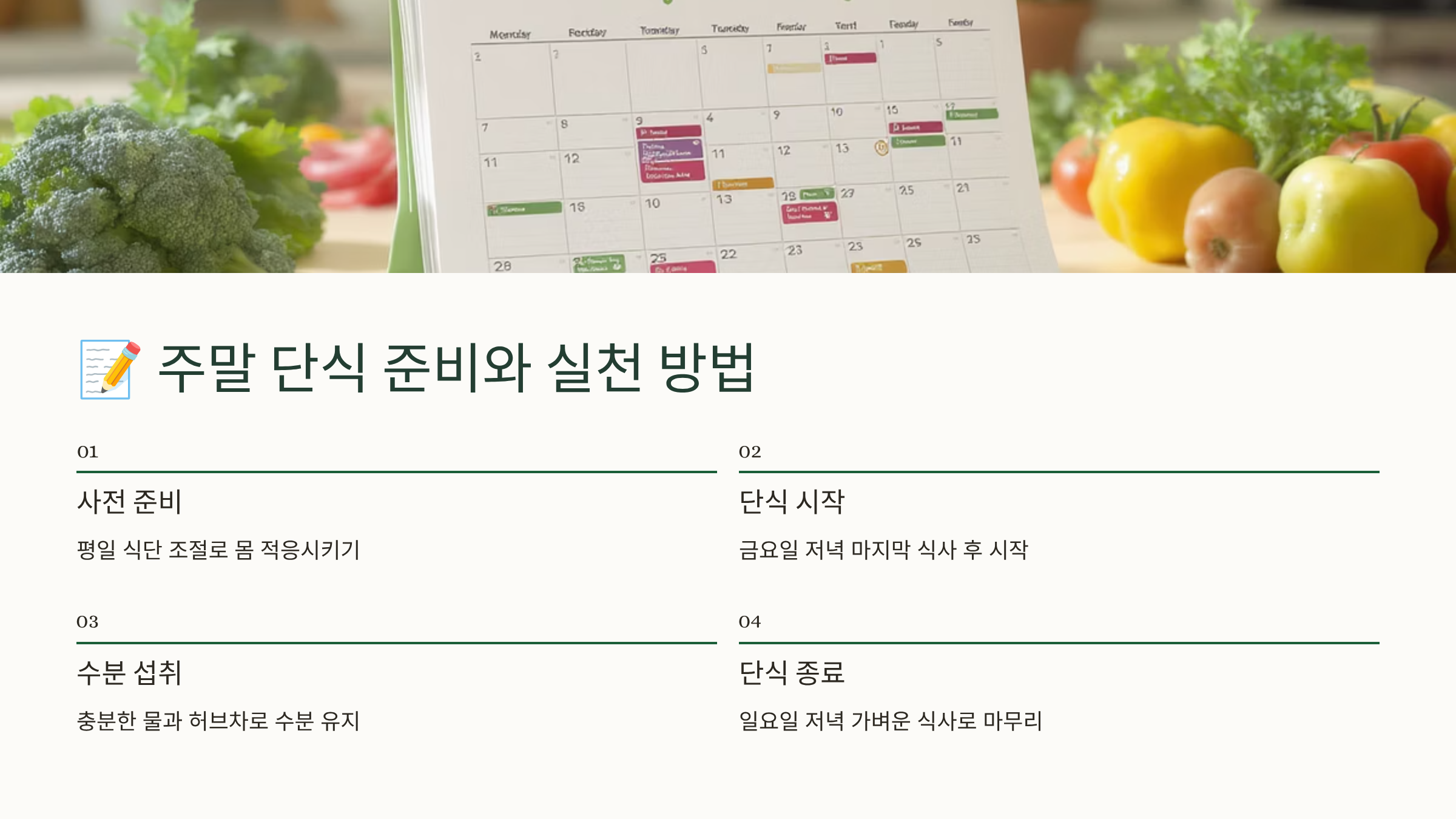 주말 단식을 시작하기 전에 철저한 준비가 필요해요. 금요일 저녁부터 서서히 식사량을 줄이는 것이 좋아요. 갑작스러운 단식은 몸에 충격을 줄 수 있거든요. 금요일 저녁은 평소의 70% 정도만 먹고, 탄수화물보다는 단백질과 채소 위주로 구성하세요. 이렇게 하면 토요일 아침부터 시작되는 단식에 몸이 더 잘 적응할 수 있어요.