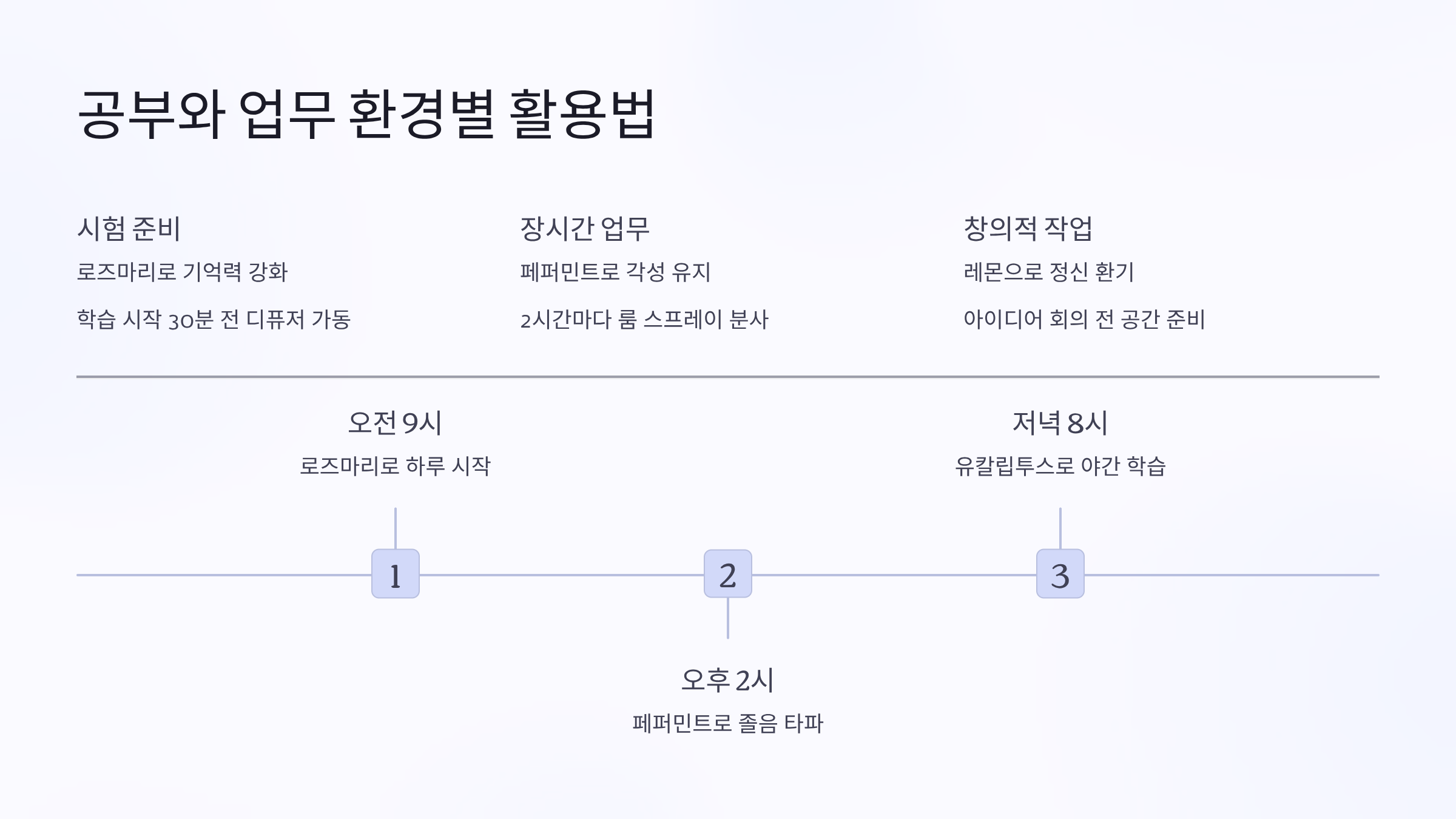 | 로즈마리 | 1,8-시네올 | 기억력 15% 향상 | 오전 9-11시 |