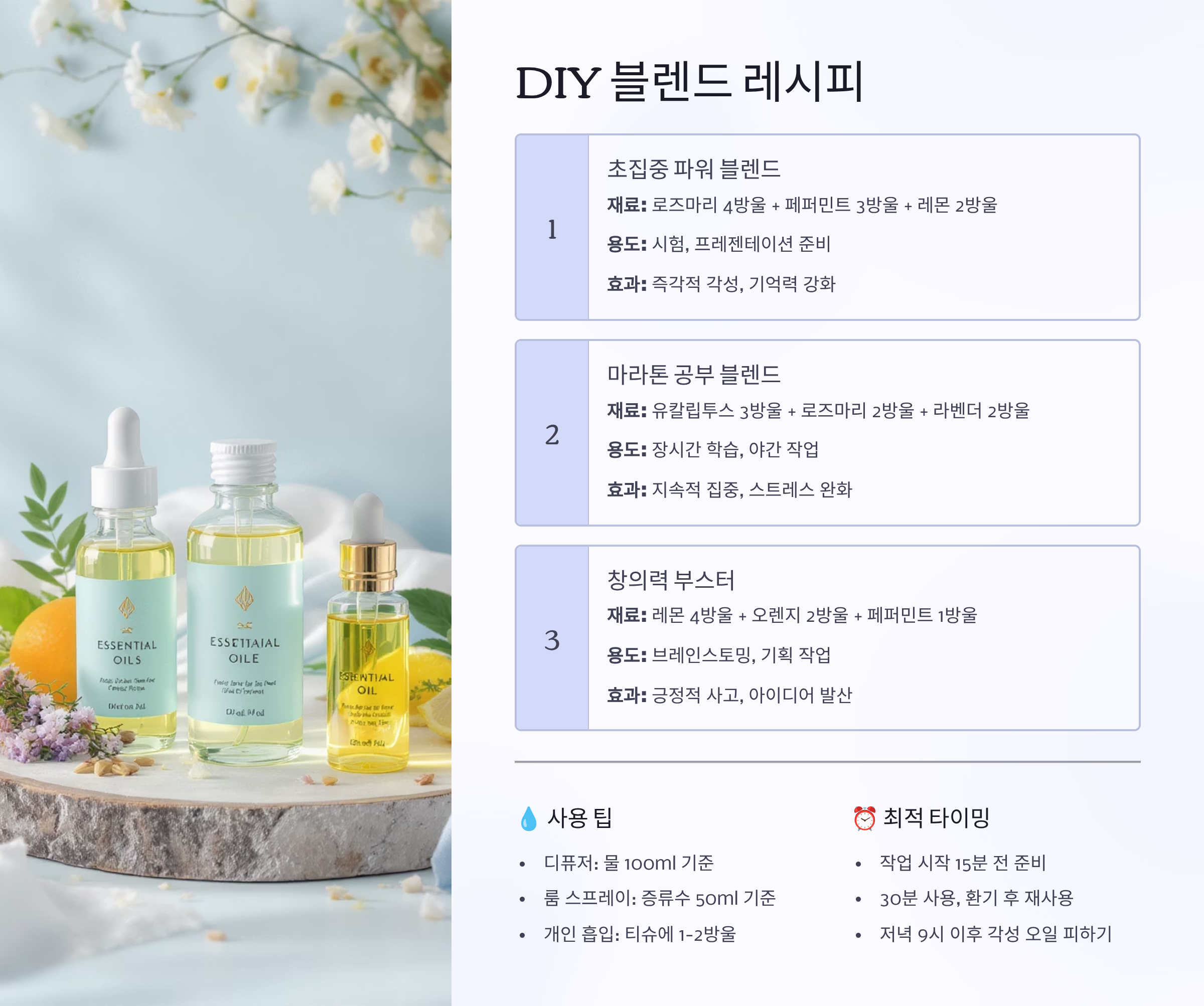 | 깊은 집중 | 로즈마리+유칼립투스+바질 | 2:2:1 | 인지력 향상 |
