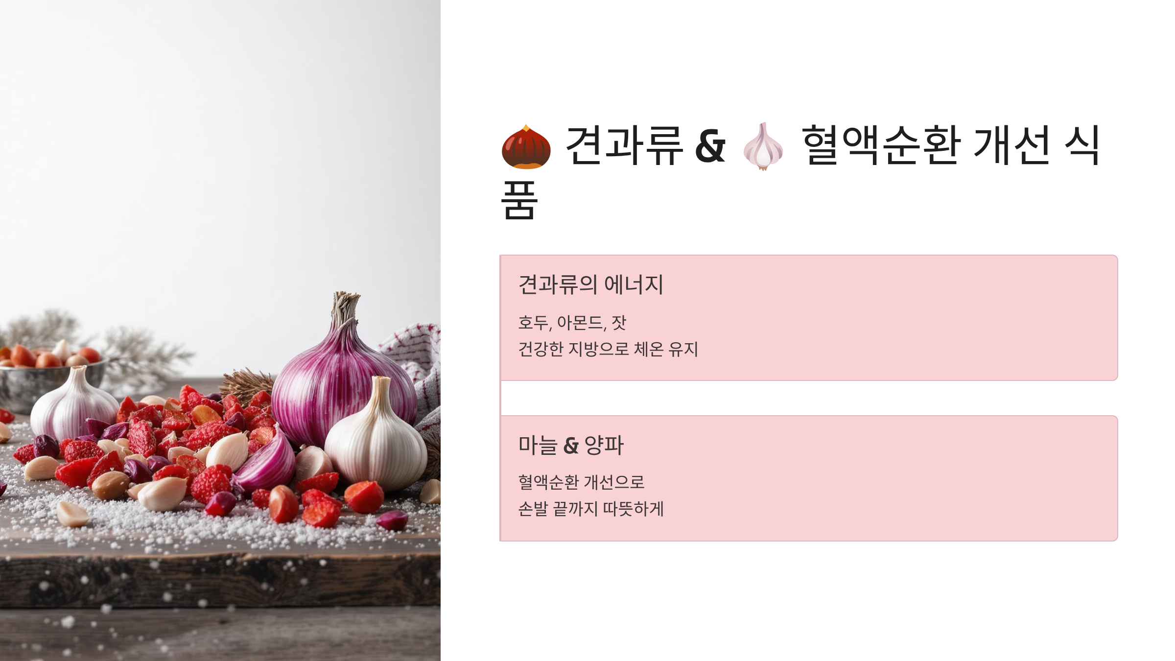 견과류는 건강한 지방과 단백질이 풍부해서 체온을 높이는 데 매우 효과적이에요. 견과류의 불포화지방산은 체내에서 천천히 연소되면서 지속적으로 열을 발생시켜요. 특히 아몬드, 호두, 캐슈너트 같은 견과류는 비타민 E와 마그네슘이 풍부해서 혈액순환도 개선해 준답니다.