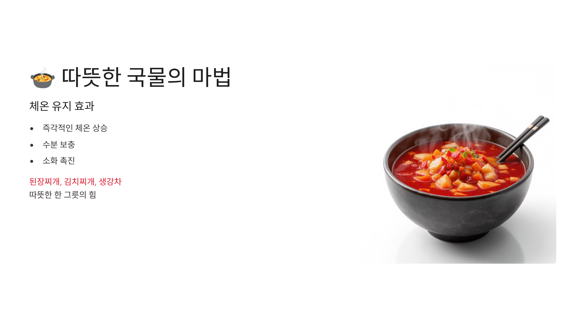따뜻한 국물 요리는 체온을 즉각적으로 높여주는 가장 효과적인 방법이에요. 국물이 위장에 들어가면서 직접적으로 체온을 올려주고, 수분 공급과 함께 영양소도 흡수하기 쉬운 형태로 제공해요. 특히 아침에 따뜻한 국을 먹으면 하루 종일 체온이 안정적으로 유지된답니다.