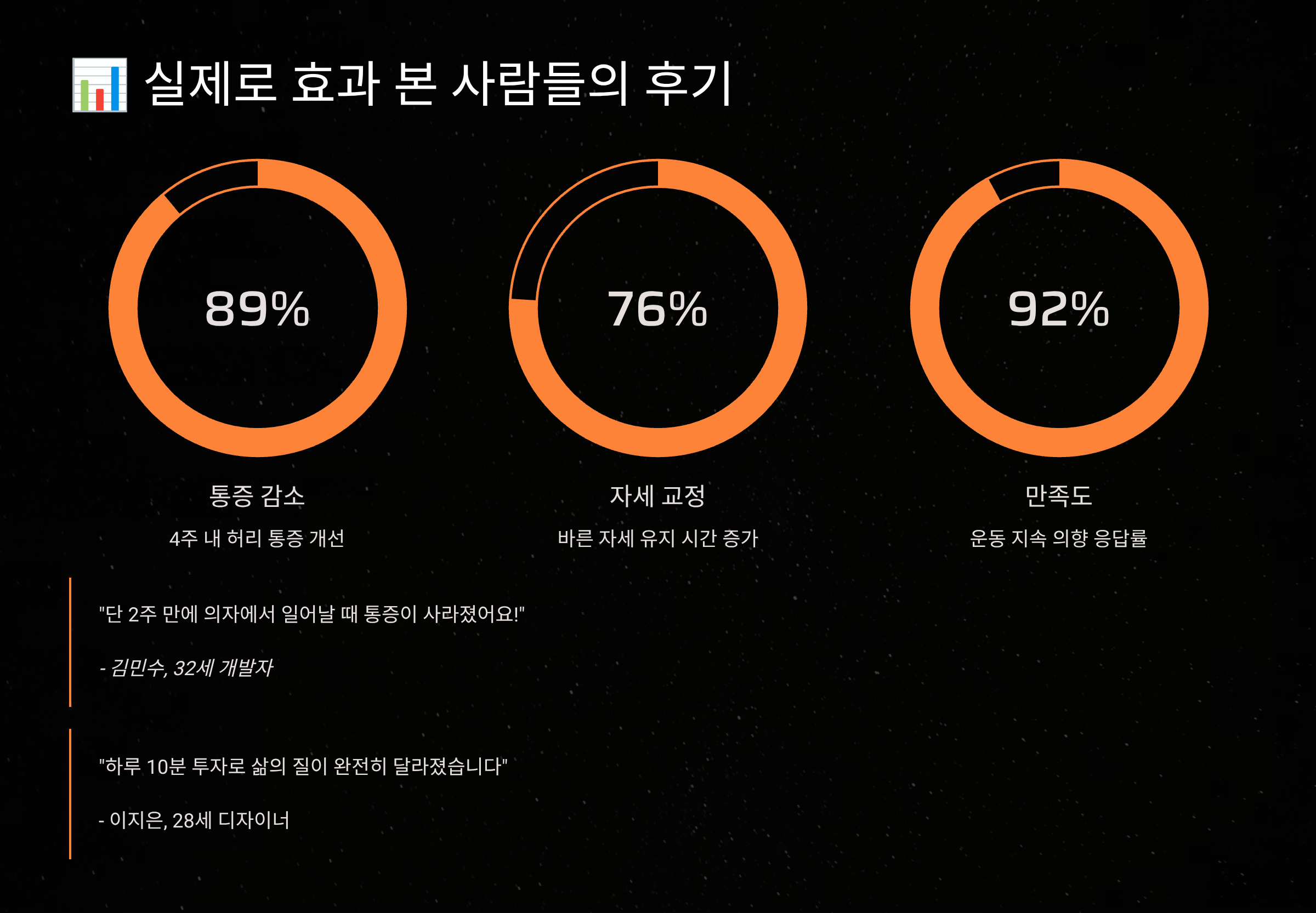 코어 운동의 효과는 이론으로만 들으면 와닿지 않을 수 있어요. 그래서 실제로 코어 운동을 통해 변화를 경험한 분들의 사례를 모아봤어요. 이 이야기들을 통해 여러분도 희망을 가지시길 바라요. 누구나 시작하면 변할 수 있으니까요!
