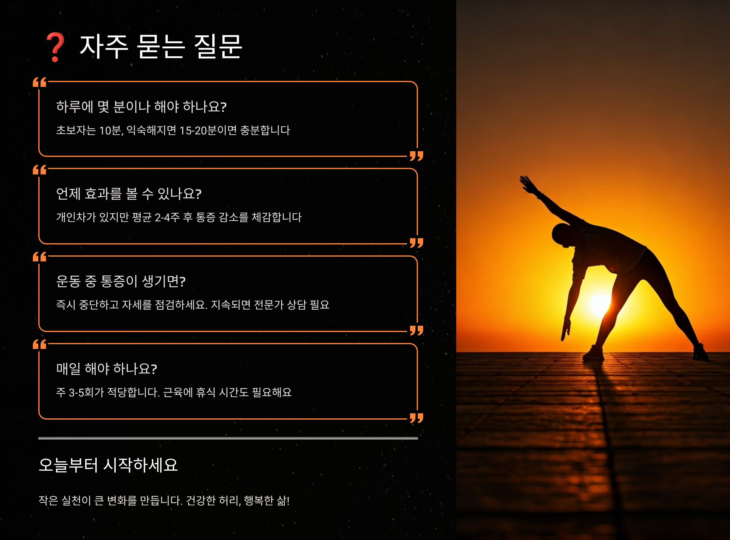 A5. 개인차가 있지만 보통 2~3주 후부터 느낌이 달라지기 시작해요. 허리 뻣뻣함이 줄고 플랭크 시간이 늘어나는 걸 느낄 수 있어요. 눈에 보이는 변화는 보통 6~8주 후에 나타나요.