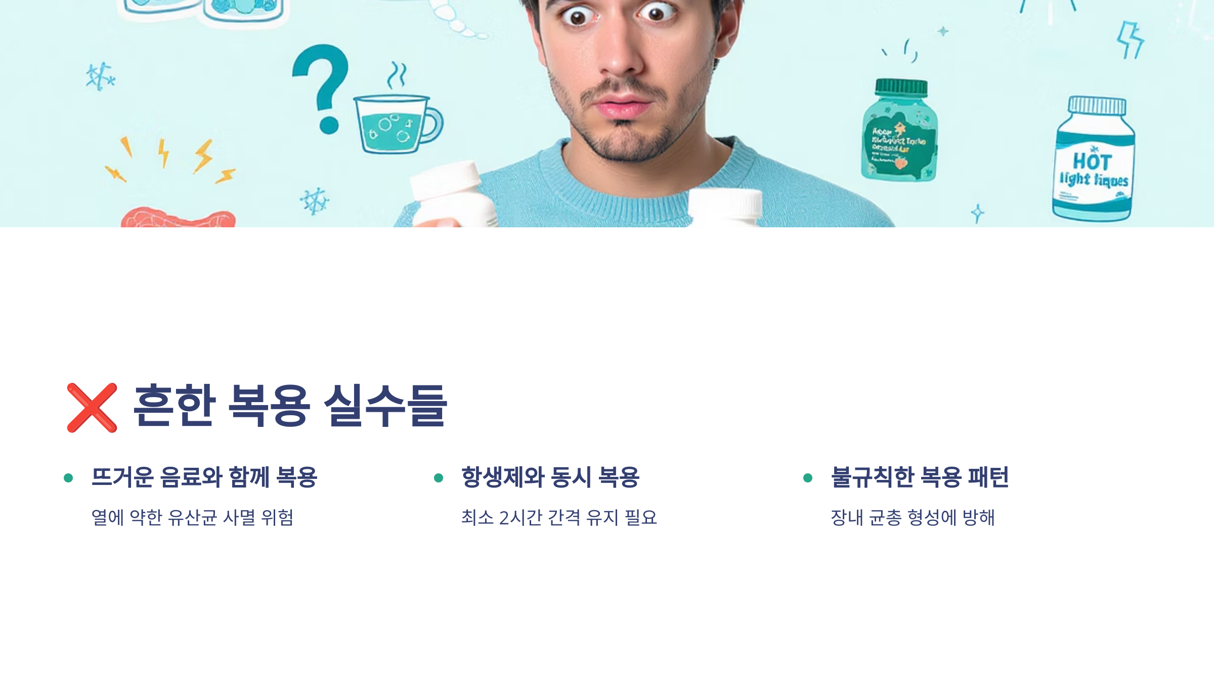 항생제와 동시 복용도 큰 실수예요. 항생제는 유해균뿐만 아니라 유익균도 죽이기 때문에 프로바이오틱스의 효과가 없어져요. 항생제 복용 후 2-3시간 뒤에 프로바이오틱스를 먹거나, 항생제 치료가 끝난 후 복용을 시작하는 게 좋아요!