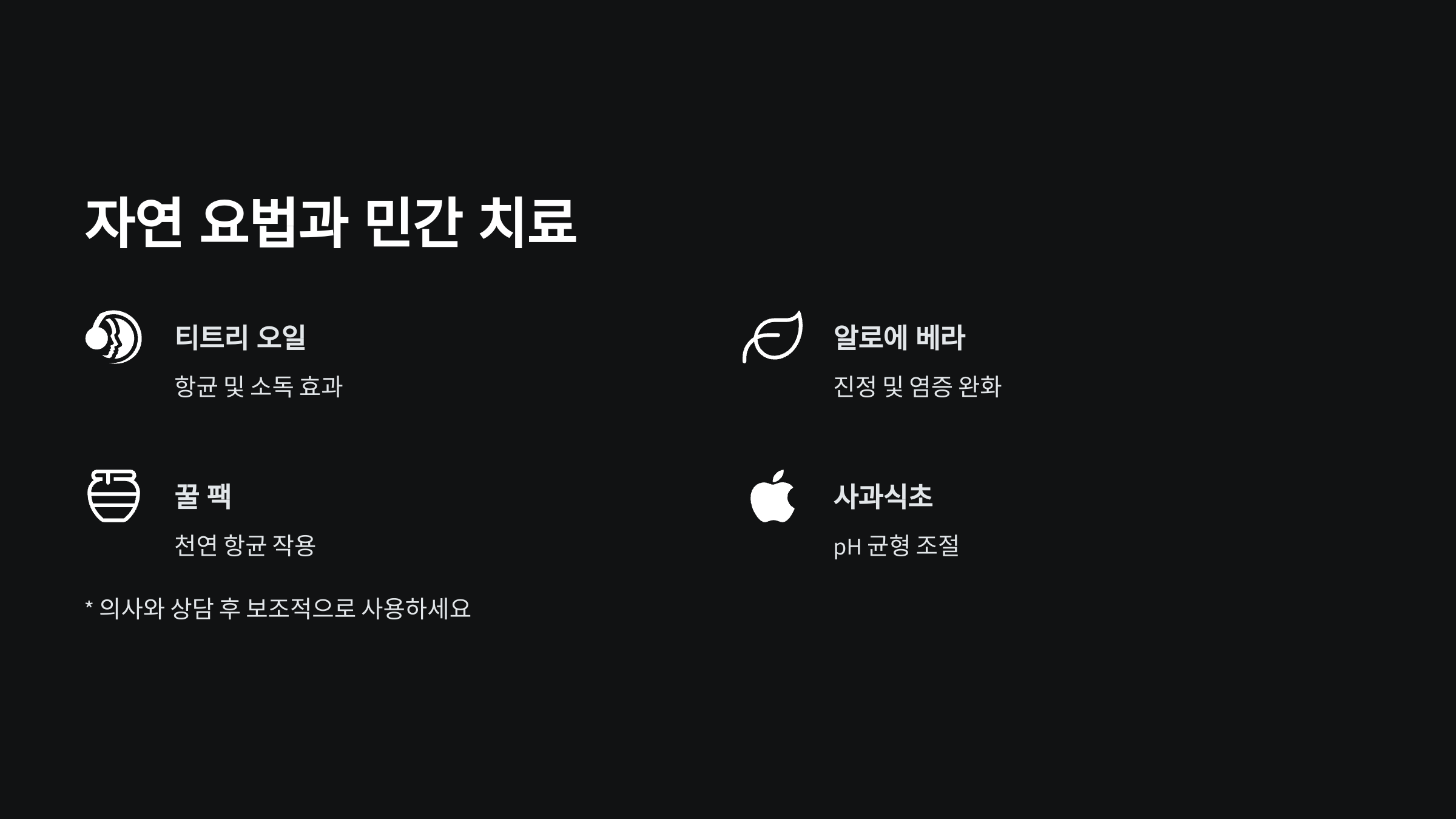 | 살리실산 | 2% 용액을 면봉으로 도포 | 건조함 유발 가능 |