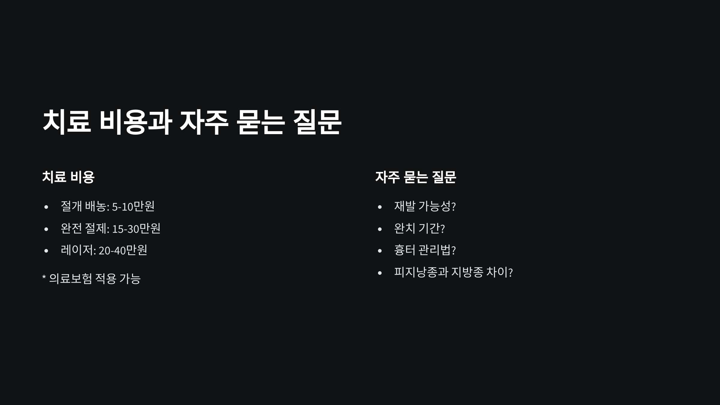 | 치료 방법 | 보험 적용 시 | 비급여 |