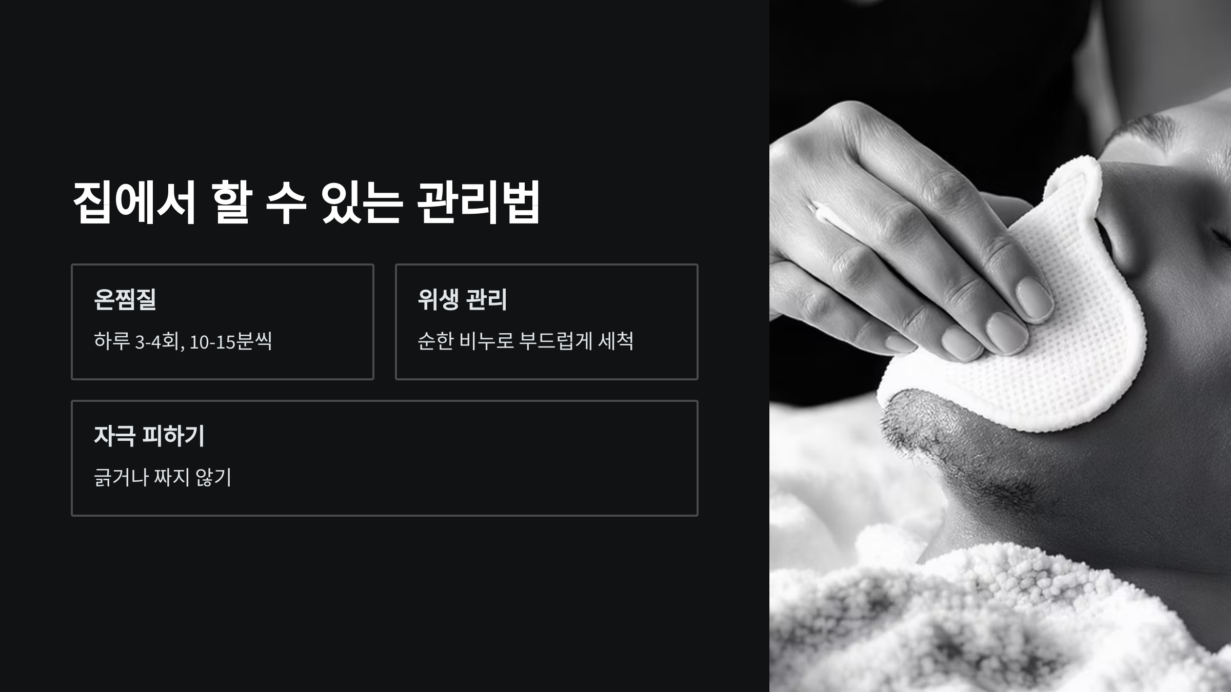 온찜질은 가장 안전하고 효과적인 홈케어 방법이에요. 따뜻한 물에 적신 수건을 낭종 부위에 10-15분간 올려두세요. 하루에 3-4번 반복하면 혈액순환이 개선되고 낭종이 자연스럽게 배출될 수 있어요. 온도는 너무 뜨겁지 않게 조절해야 해요.
