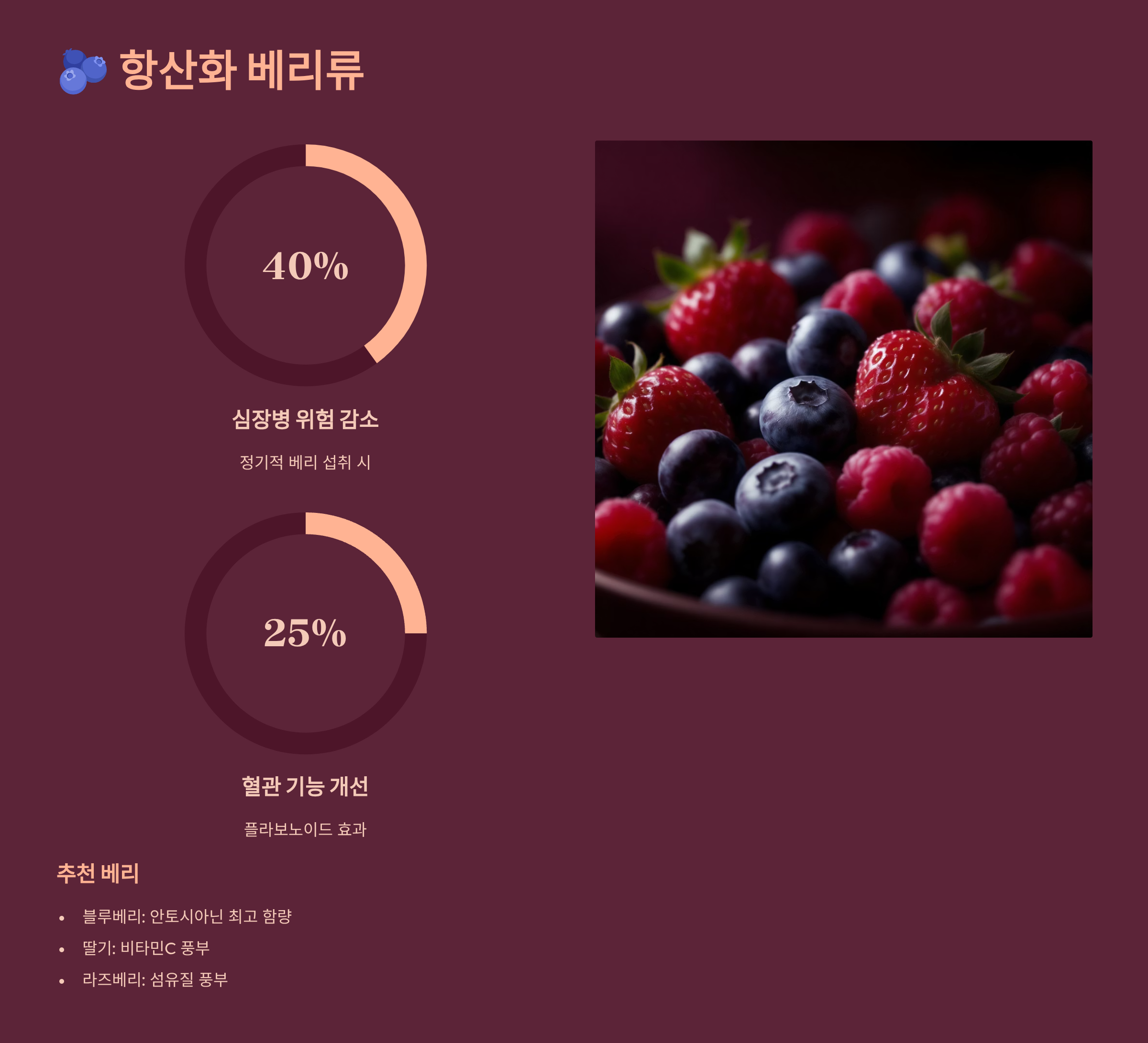 베리류는 자연이 선물한 항산화 폭탄이에요. 블루베리, 딸기, 라즈베리, 블랙베리 등은 안토시아닌이라는 강력한 항산화 물질을 함유하고 있답니다. 이 성분은 혈관 내벽을 보호하고 염증을 줄이며, 혈압을 낮추는 효과가 있어요. 하루에 베리류를 한 컵씩 먹으면 심장마비 위험이 32% 감소한다는 연구 결과가 있답니다.