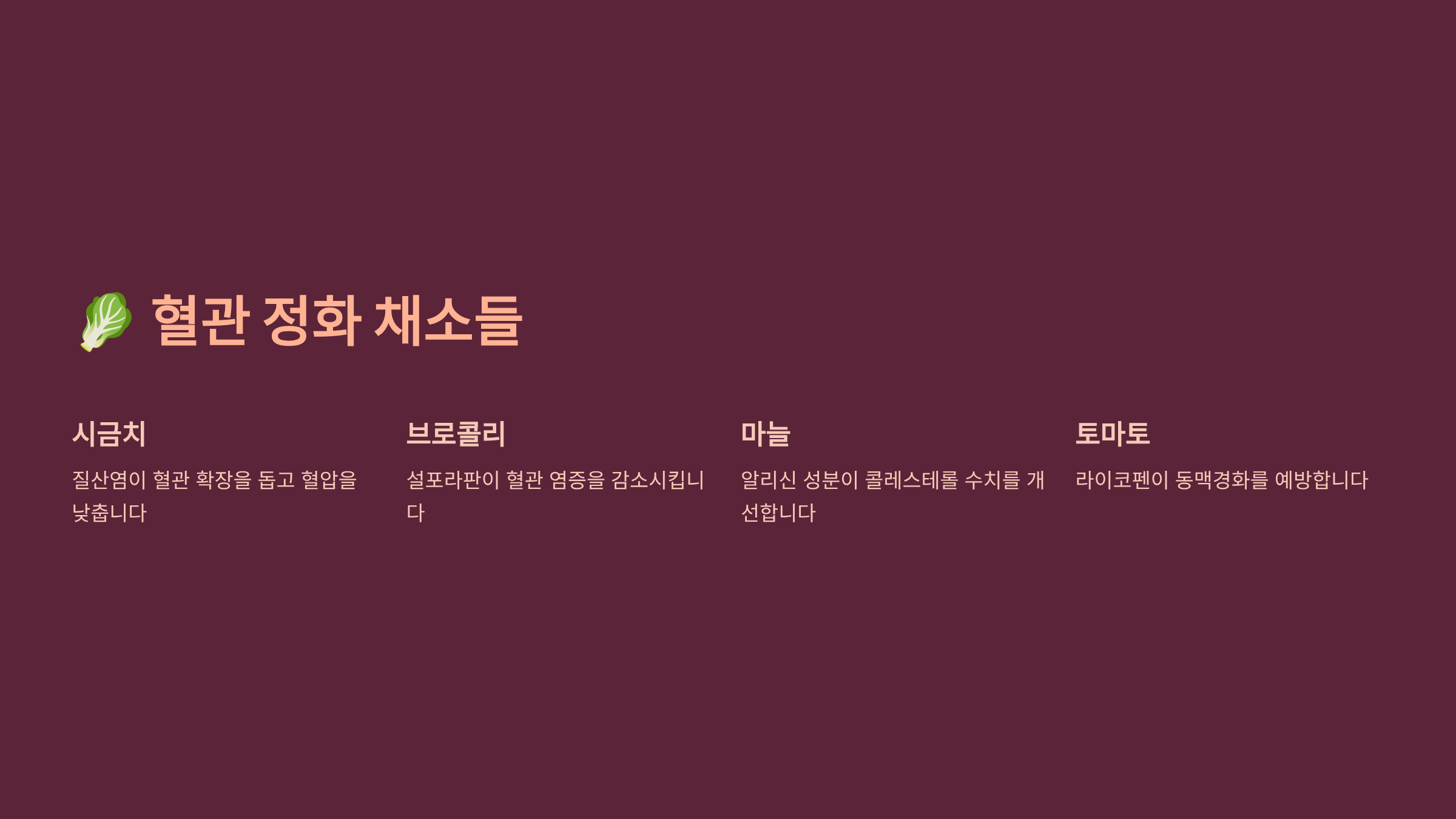 | 채소 | 주요 영양소 | 혈관 건강 효과 |