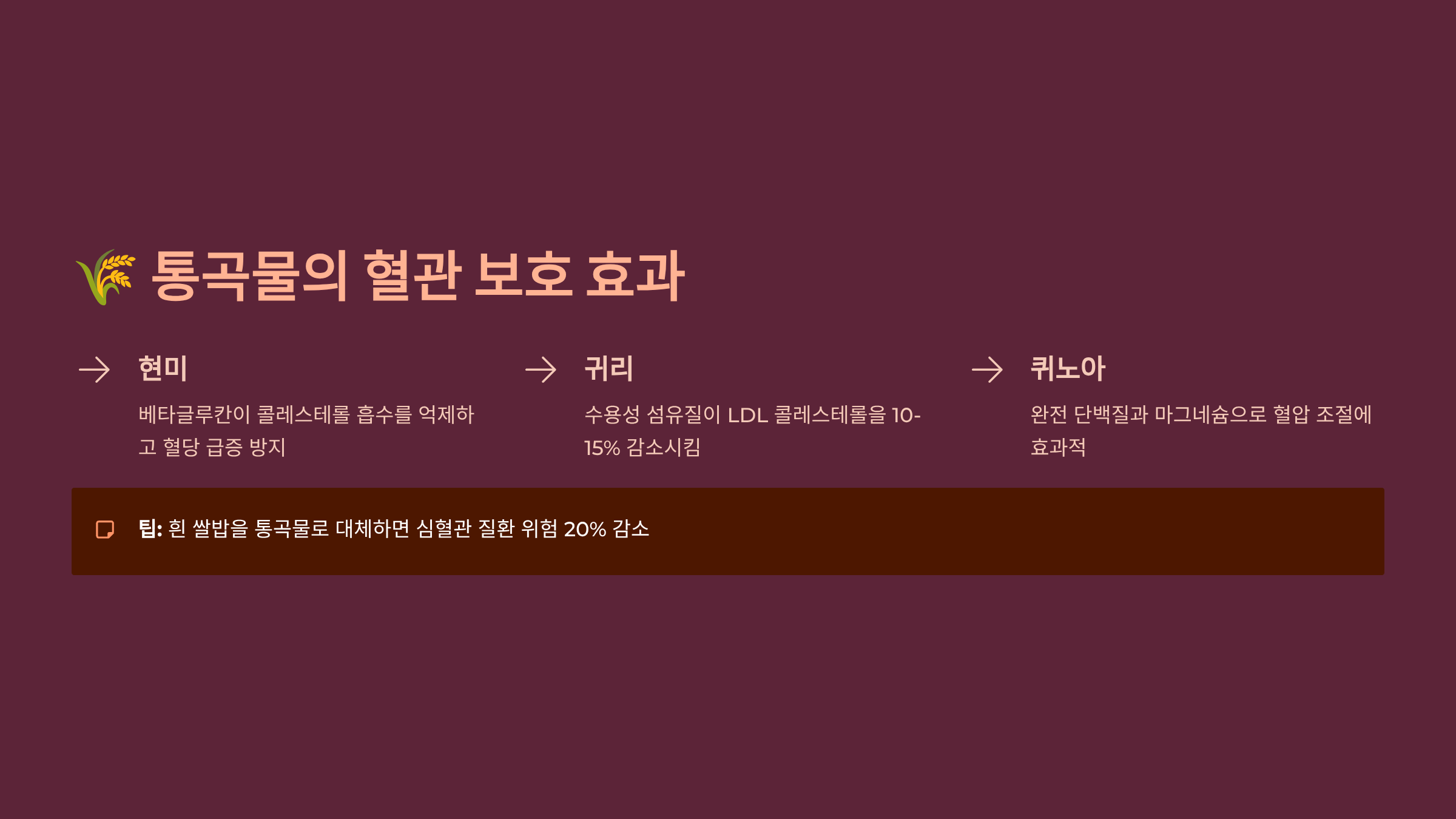 통곡물은 정제되지 않은 곡물로 혈관 건강에 필수적인 식품이에요. 귀리, 현미, 퀴노아, 메밀 같은 통곡물에는 베타글루칸이라는 수용성 식이섬유가 풍부하답니다. 이 성분은 콜레스테롤을 흡착해 체외로 배출시키는 역할을 해요. 하루에 통곡물을 3회 이상 섭취하면 심장병 위험이 22% 감소한다는 연구 결과가 있어요.