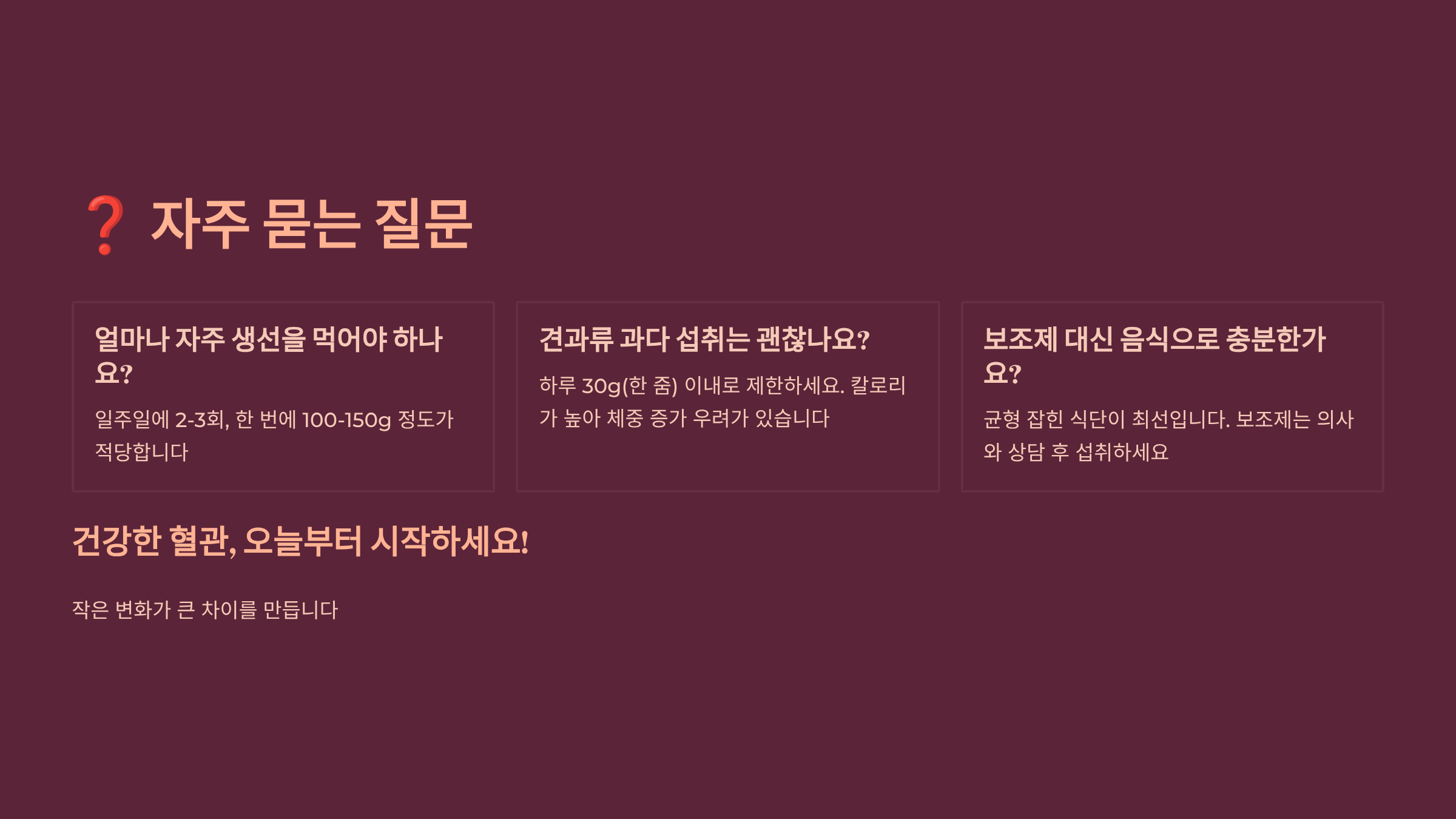 A7. 종합적인 접근이 가장 효과적이에요. 혈관 청소 음식을 매일 섭취하면서 동시에 규칙적인 운동(주 5회, 30분 이상), 금연, 절주, 체중 관리, 스트레스 관리를 병행하세요. 일반적으로 2-3개월 정도 꾸준히 실천하면 혈압, 콜레스테롤 수치에서 개선을 확인할 수 있어요. 급격한 변화보다는 지속 가능한 습관 형성이 중요해요.