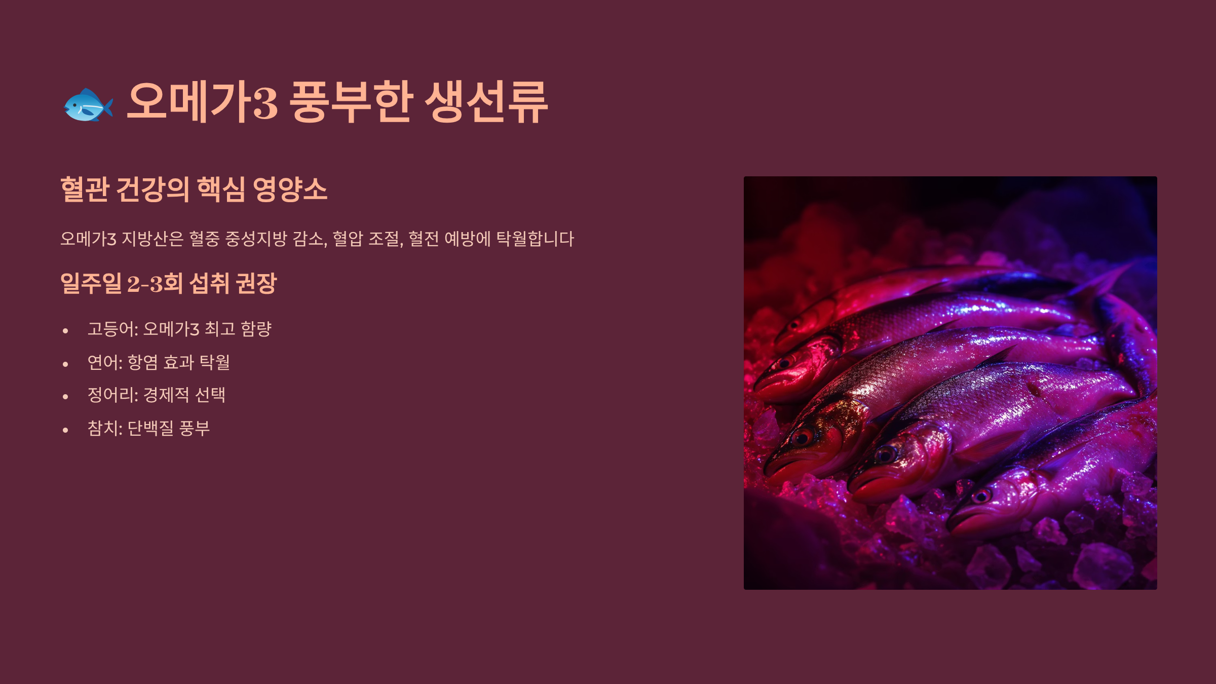 오메가 3 지방산이 풍부한 생선은 혈관 청소의 일등공신이에요. 특히 고등어, 연어, 정어리 같은 등 푸른 생선에는 EPA와 DHA가 풍부하게 들어있답니다. 이런 성분들은 혈중 중성지방을 감소시키고 좋은 콜레스테롤인 HDL을 증가시켜요. 일주일에 2-3회 정도 생선을 섭취하면 심혈관 질환 위험을 크게 줄일 수 있어요.
