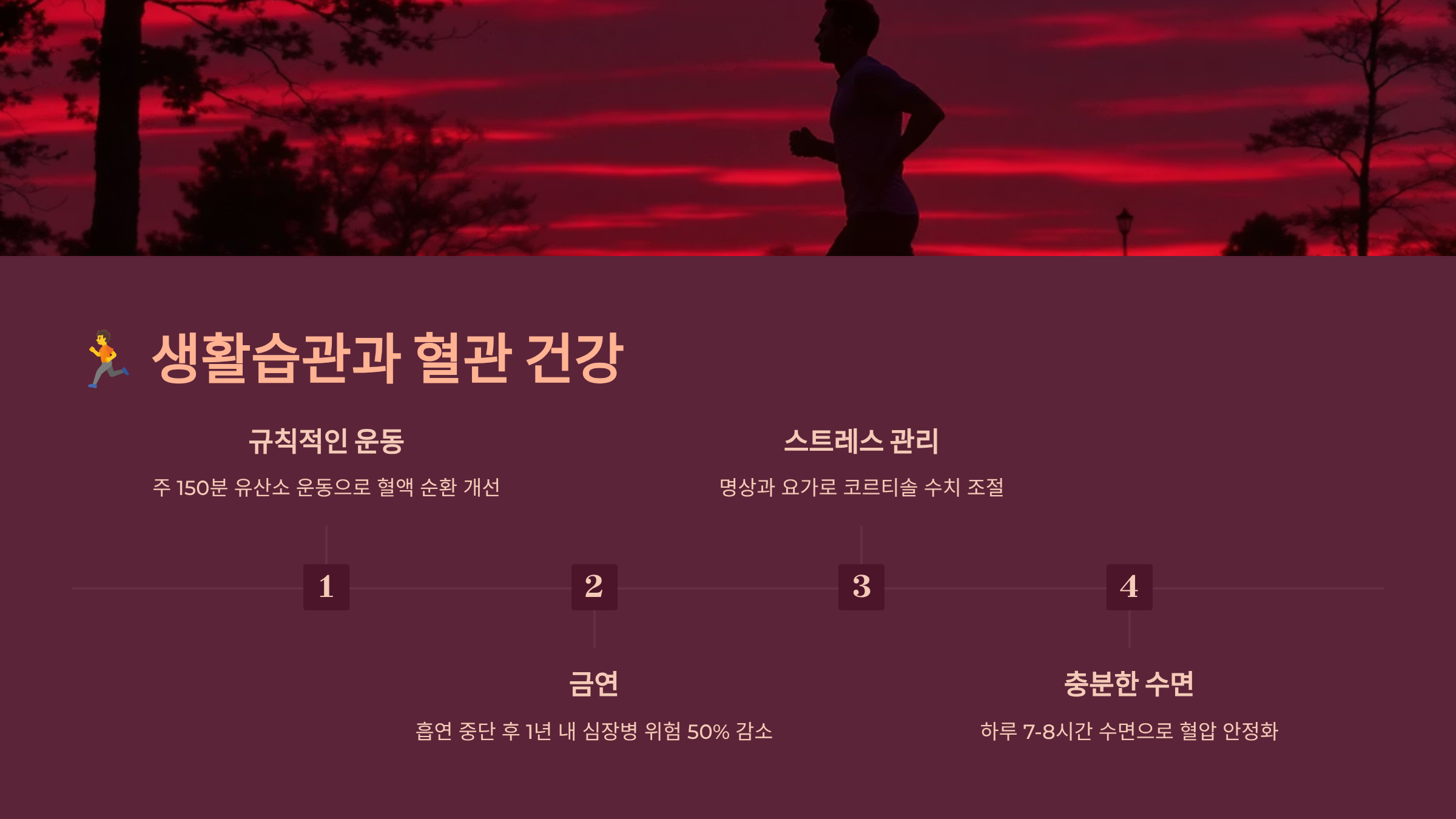 혈관 건강은 음식만으로 지킬 수 없어요. 규칙적인 운동, 스트레스 관리, 충분한 수면 등 전반적인 생활습관이 중요하답니다. 일주일에 150분 이상의 중강도 유산소 운동을 하면 혈압이 낮아지고 혈액순환이 개선돼요. 걷기, 수영, 자전거 타기 같은 운동을 꾸준히 하는 것이 혈관 건강의 비결이에요.