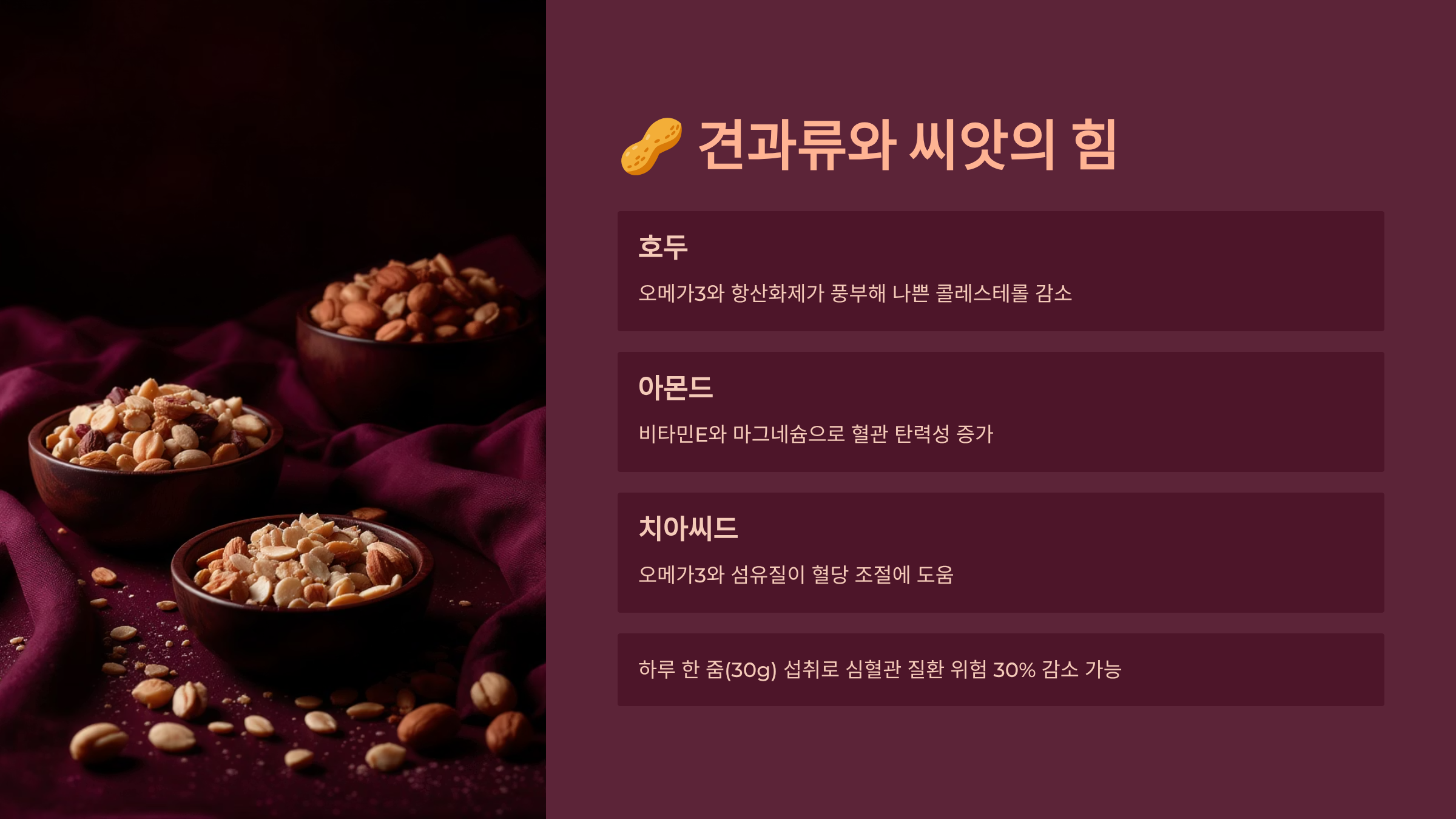 견과류는 작지만 강력한 혈관 청소 도우미예요. 호두, 아몬드, 피스타치오 같은 견과류에는 불포화지방산, 식이섬유, 비타민E가 풍부하게 들어있답니다. 특히 호두는 식물성 오메가 3인 알파리놀렌산이 풍부해서 혈관 건강에 탁월한 효과를 보여요. 하루에 한 줌(약 30g) 정도의 견과류를 먹으면 심장병 위험이 30% 감소한다고 해요.